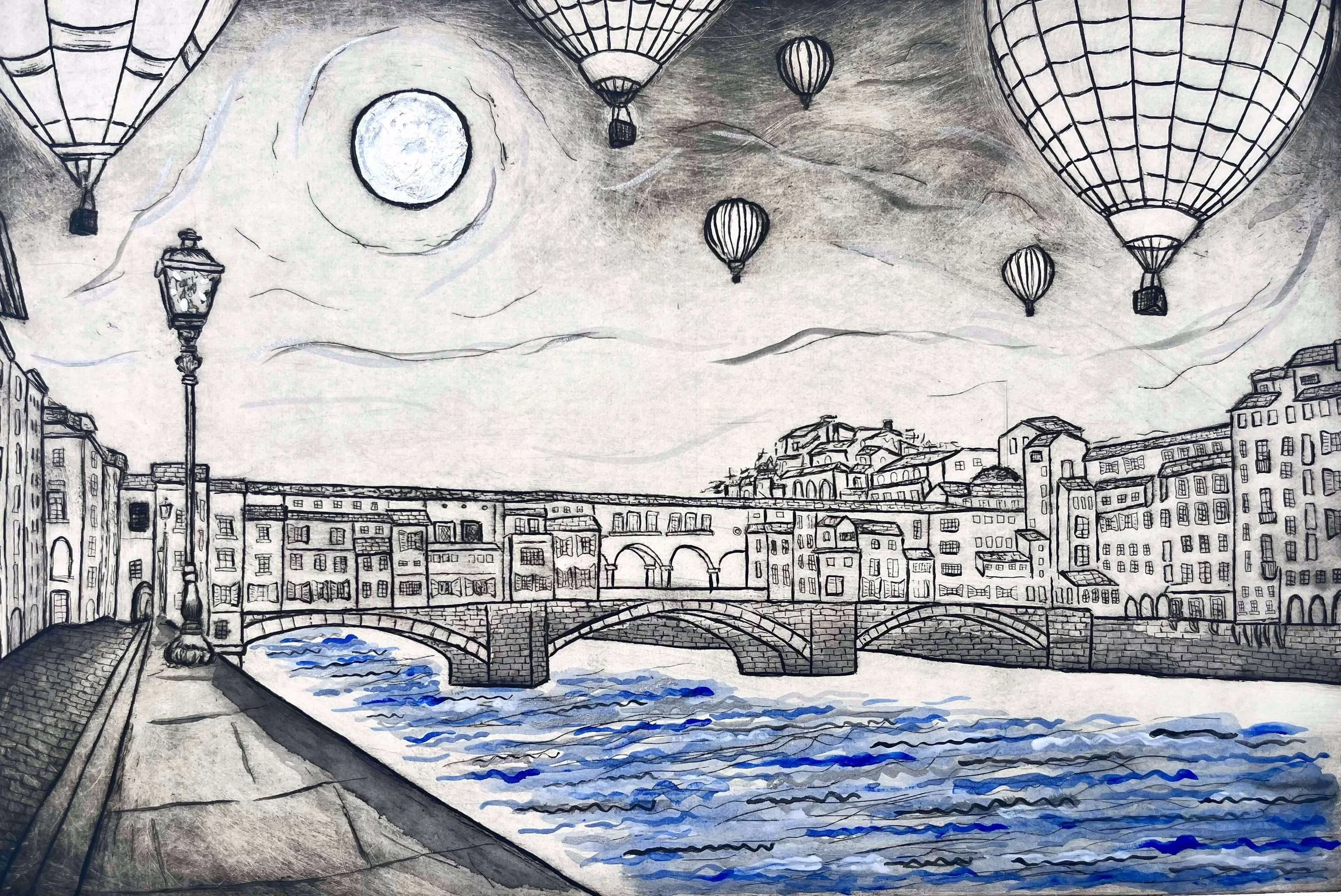 Motherhood is a beautiful thing. I’ve devoured this role, engulfed its beauty and cherished it entirely. But there is a moment where I look in the mirror and don't recognise the person staring back. There is a time when we all look in the mirror wondering how did we get here? How did our journey lead us to this point? Architect of Dreams is inspired by reclaiming identity, finding oneself again and dreaming about possibilities. I have focussed on symbolism where the hot air balloon is representative of freedom, hope and adventure. The ultramarine blue hues, silver leaf/pigment and ephemeral tones aim to evoke imagination and memories of childhood. There is a certain strength and resilience in the position of the figure and how she paints the sky so confidently. The halo effect around her is delicate and soft from the inked plate tone and lightness creates a sense of hope, perhaps hope about the future or what's to come.
