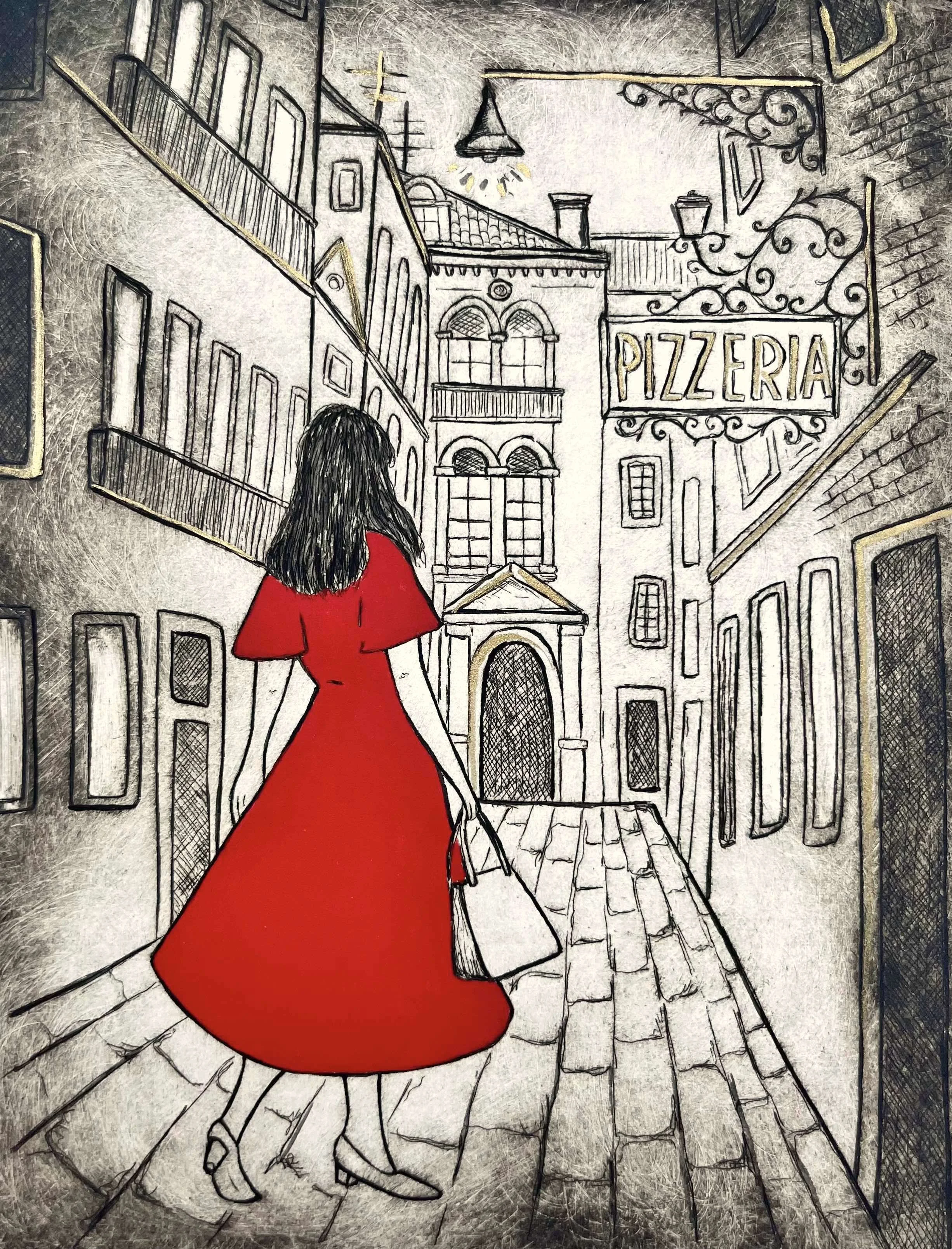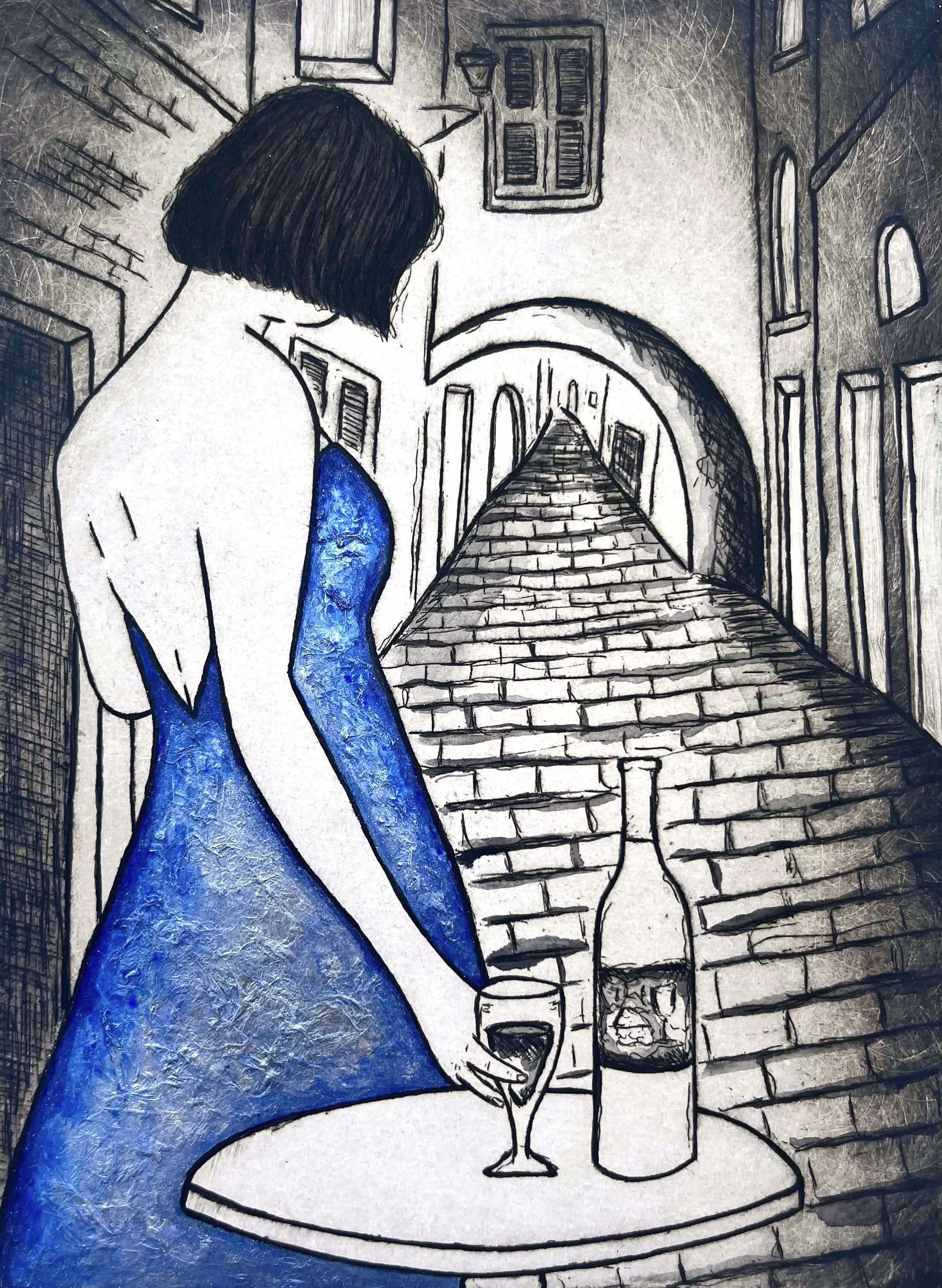 This etching was created as a smaller commissioned version of Romance in Monterosso for one of my clients who loves travelling. We share this interest and I love how this smaller etching captures a different feeling, perhaps an even more intimate memory. The ultramarine blue in the dress emphasises a dreamy and ethereal quality as she reflects into the distance.