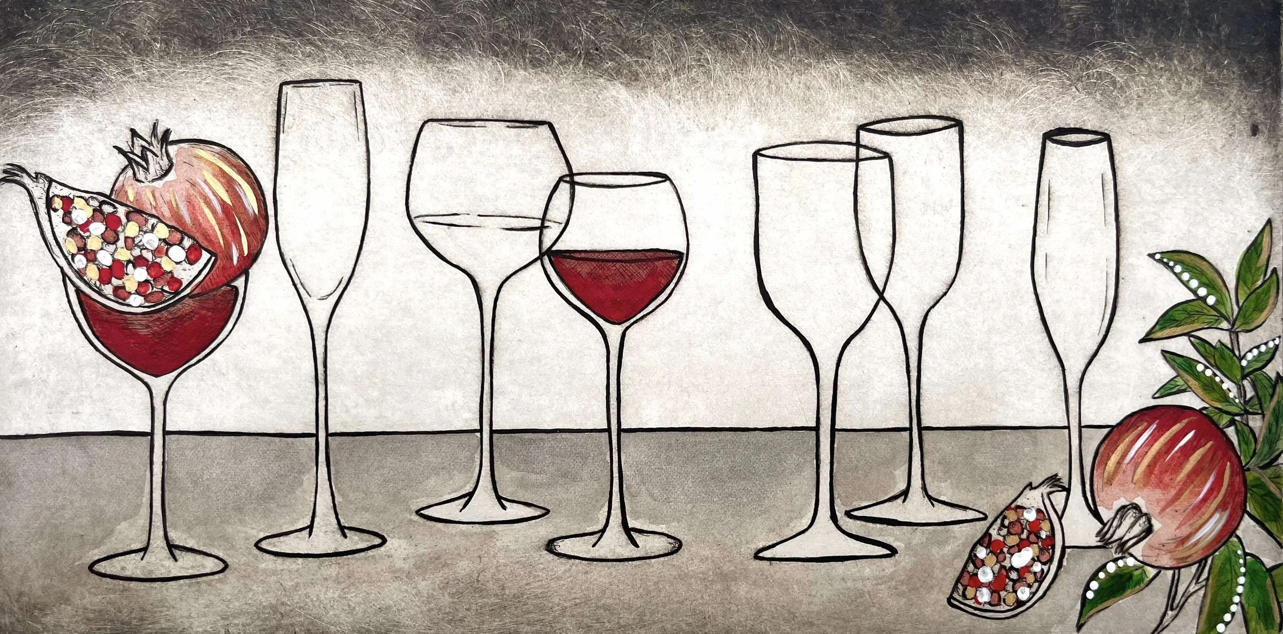 That memory was from over a decade ago, but I’ve found the symbol of wine and the ‘vessel’ ever changing. In my early thirties I got married, moved to Brisbane, bought a house but we struggled to get pregnant. It was a battle for me and I was incredibly sick during my first pregnancy. The concept of the vessel changed for me as I saw its sacred symbol in many cultures. The wine cup has got a specific utilitarian purpose however it has been also religious connotations such as in Christianity and The Last Supper. In ancient Greek mythology, wine could be associated with fertility such as Dionysus, the God of Wine-making, orchards and fruit vegetation. Pomegranate were also a strong motif for fertility, featuring in the myth of Hades and Persephone. Pomegranates also feature in Jewish and Hindu traditions symbolising prosperity and fertility. I have incorporated these two motifs in this whimsical composition to capture my personal journey, a juxtaposition between the delights and struggles of life.